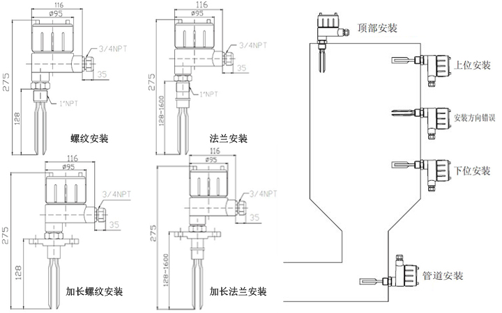 二、音叉物位开关外形尺寸图及安装示意图: